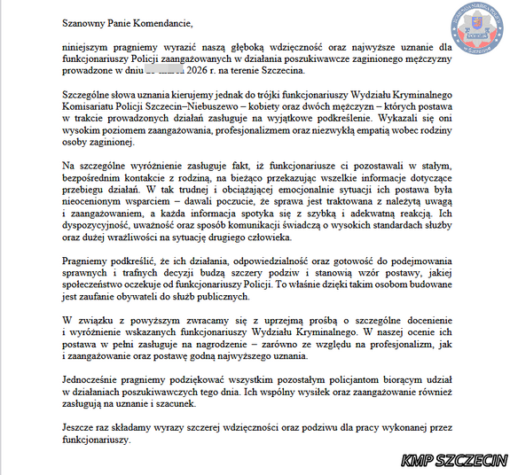 Do Komisariatu Policji Szczecin Niebuszewo wpłynęły podziękowania od obywatela za zaangażowanie funkcjonariuszy w działania poszukiwawcze osoby zaginionej.