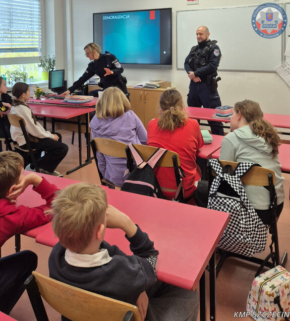 Na prośbę Dyrekcji Szkoły Towarzystwa Oświatowego w Szczecinie, funkcjonariusze Komisariatu Policji Szczecin Nad Odrą - dzielnicowy oraz asystent Wydziału Prewencji - przeprowadzili spotkanie profilaktyczne z uczniami klas IV.