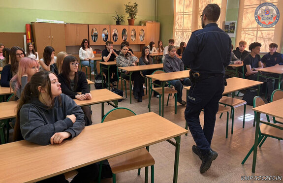 Uczniowie oraz studenci uczestniczyli w spotkaniu poświęconym odpowiedzialności prawnej nieletnich oraz prawom człowieka. Zajęcia poprowadził funkcjonariusz Wydziału Prewencji Komendy Miejskiej Policji w Szczecinie.