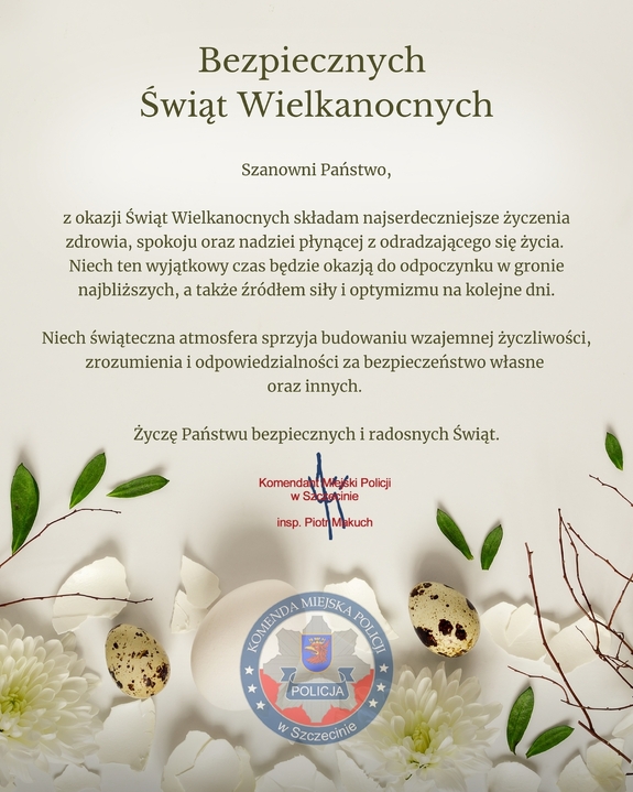 Komendant Miejski Policji w Szczecinie, inspektor Piotr Makuch, z okazji Świąt Wielkanocnych złożył życzenia wszystkim policjantkom, policjantom i pracownikom Policji, a także mieszkańcom Szczecina i regionu.