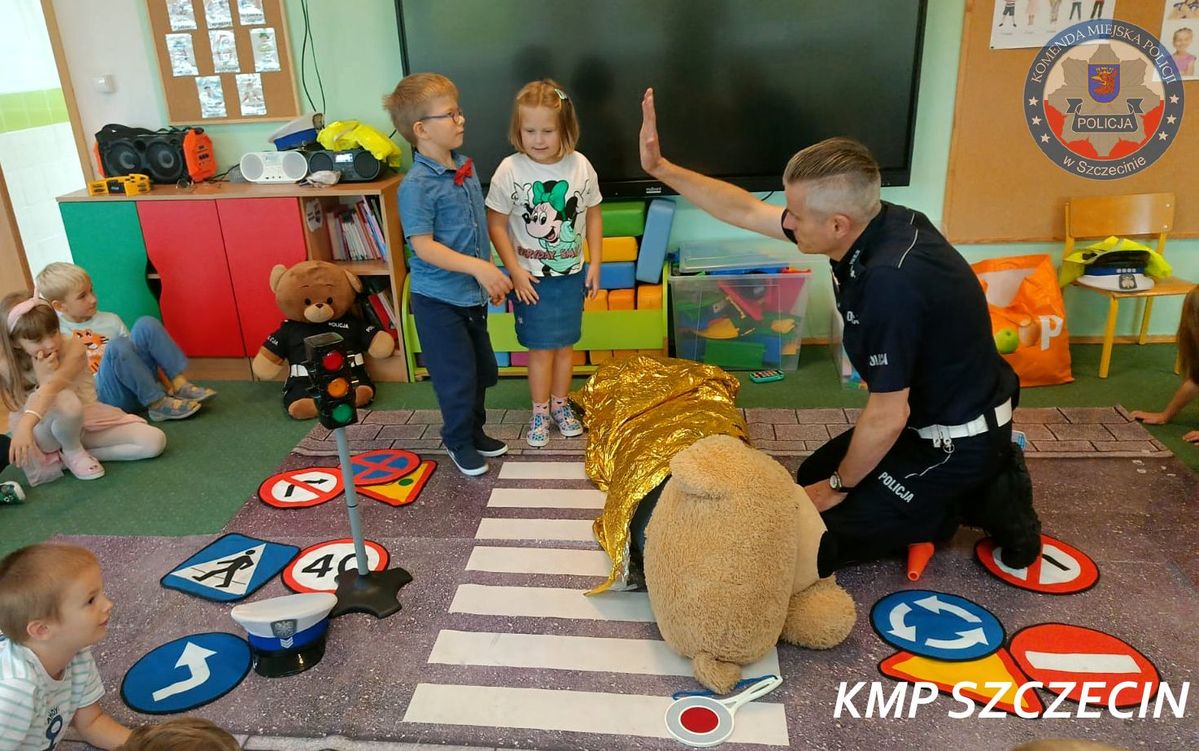 Prawdziwą furorę wśród przedszkolaków zrobili jednak specjalni goście, którzy wspierali policjantów w ich pracy edukacyjnej. Policyjne maskotki – Miś Radarek oraz jego przyjaciel Miś Henio – pomagały dzieciom w praktycznej nauce zasad oraz podstaw pierwszej pomocy przedmedycznej, wzbudzając uśmiech i wielkie emocje. Dzięki ich obecności nauka przez zabawę stała się jeszcze bardziej efektywna, a przekazywana wiedza na długo pozostanie w pamięci najmłodszych.
