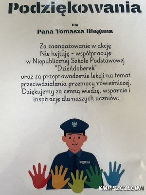 Asystent do Spraw Nieletnich z Komisariatu Policji Szczzecin Niebuszewo Szczecin, odwiedził uczniów z Niepublicznej Szkołę Podstawową „Dzieńdoberek”. Tematem pogadanki była: „Tolerancja i szacunek to Twój wizerunek”