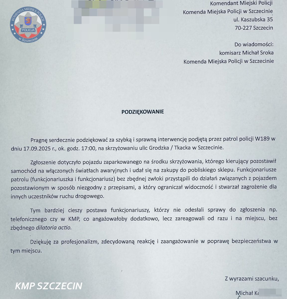 Drugie podziękowanie odnosiło się do interwencji patrolu ze szczecińskiego Śródmieścia. Szybka i sprawna reakcja funkcjonariuszy, którzy bezzwłocznie zareagowali na źle zaparkowany pojazd, uratowała innych kierowców przed potencjalnym zagrożeniem. Mimo że kierowca auta odszedł, pozostawiając je na drodze, policjanci nie czekali na rozwój sytuacji i natychmiast zadbali o bezpieczeństwo.