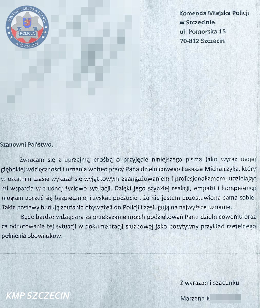 Mieszkańcy Szczecina doceniają służbę naszych policjantów, czego dowodem są pisma, które regularnie wpływają na ręce Komendanta Miejskiego Policji w Szczecinie. W ciągu ostatnich dni do jednostki trafiły kolejne podziękowania za profesjonalizm i zaangażowanie.