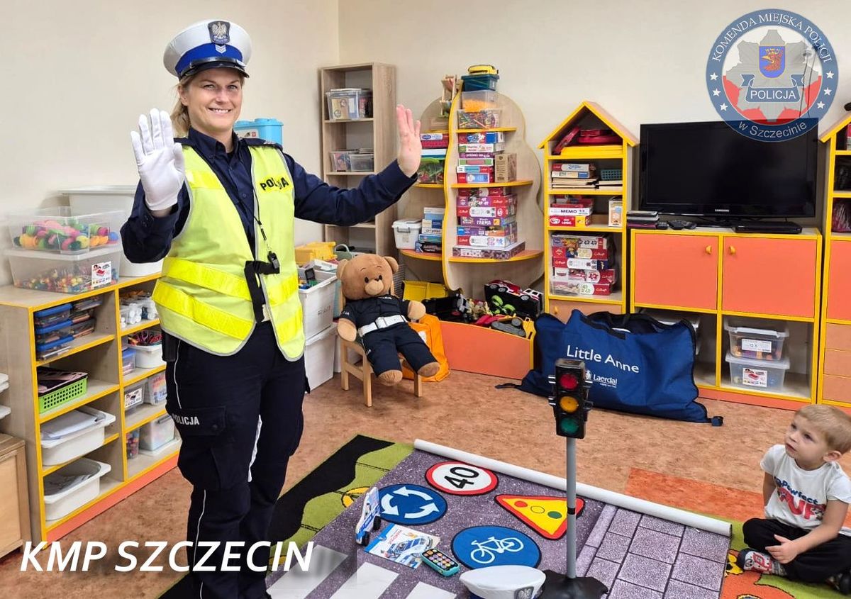 Policjantka z Wydziału Ruchu Drogowego Komendy Miejskiej Policji w Szczecinie po raz kolejny odwiedziła najmłodszych mieszkańców naszego miasta. Tym razem spotkanie odbyło się w Przedszkolu nr 48, a towarzyszył jej dobrze znany dzieciom i uwielbiany przez nie Miś Henio – policyjna maskotka.