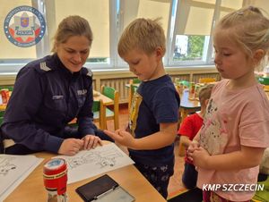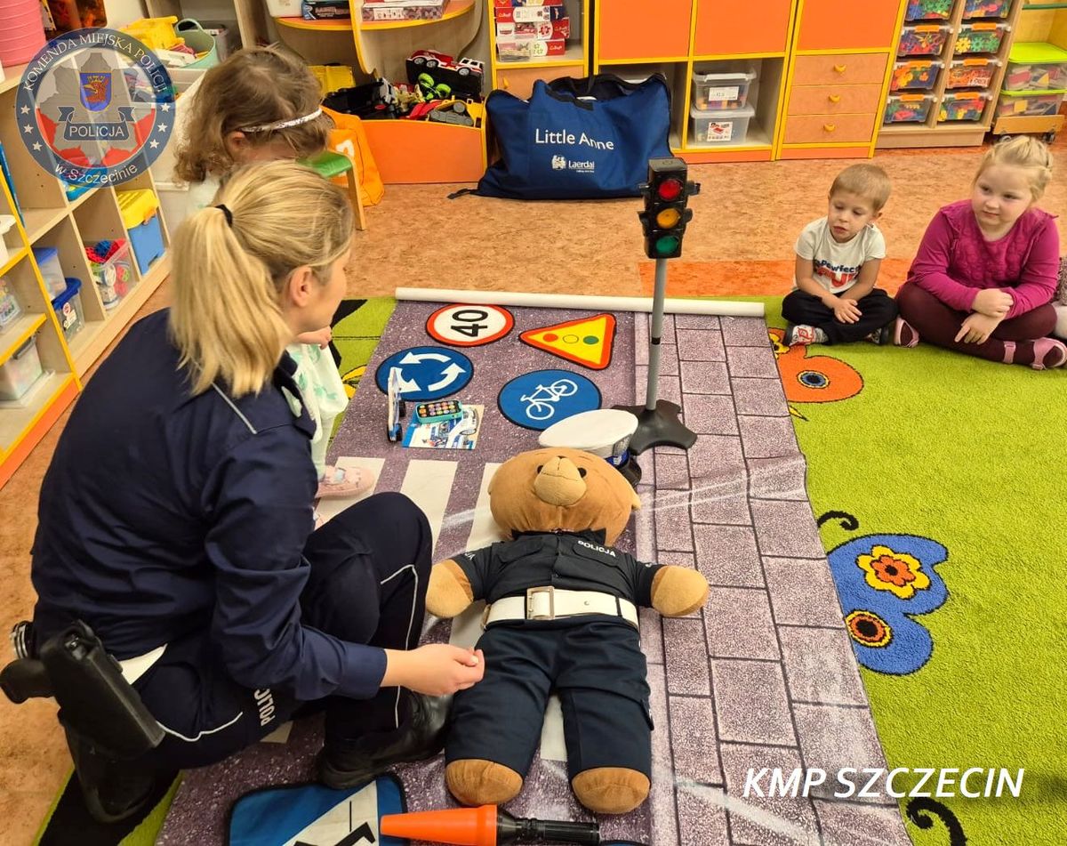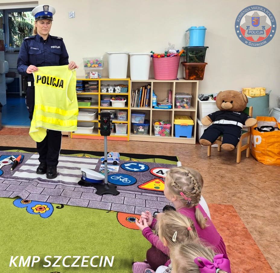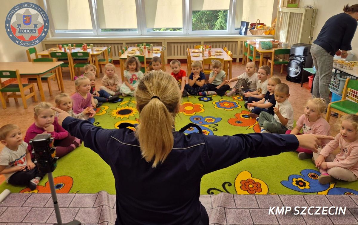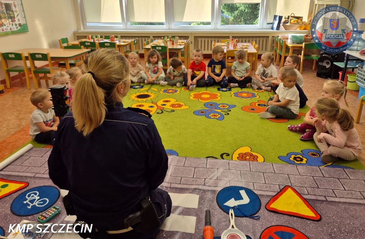 Podczas zajęć przedszkolaki wzięły udział w zabawie połączonej z nauką zasad bezpiecznego poruszania się po drogach. Policjantka w przystępny sposób przypomniała dzieciom, jak prawidłowo przechodzić przez jezdnię, dlaczego warto nosić elementy odblaskowe i jak zachować się w pobliżu przejścia dla pieszych.