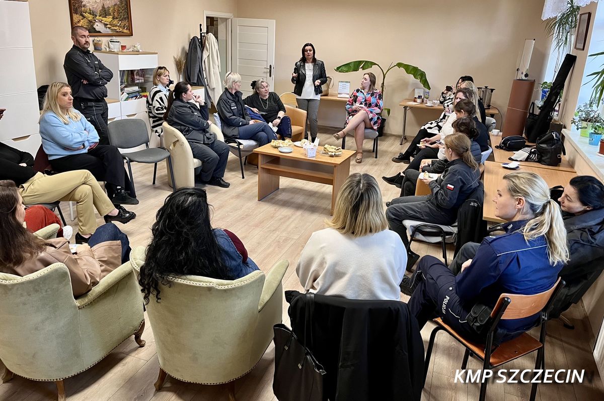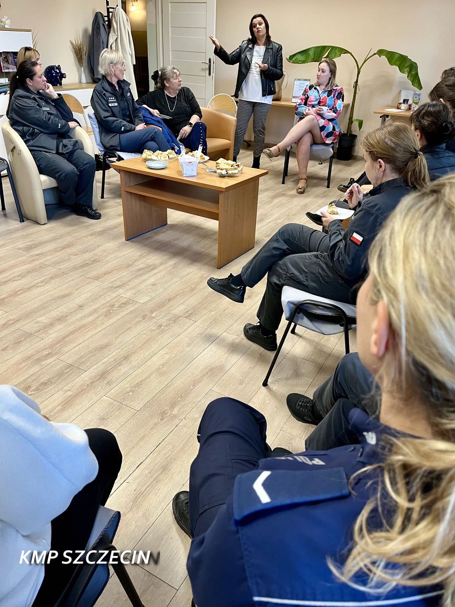 Po części warsztatowej uczestnicy warsztatów udali się na ul. Piaseczną 4 gdzie przez „Caritas” Archidiecezji Szczecińsko-Kamińskiej prowadzone jest schronisko dla kobiet i matek z dziećmi. Na miejscu funkcjonariusze zapoznali się z bazą materialną placówki oraz uczestniczyli w dyskusji odnośnie pomocy kobietom i dzieciom, które z różnych powodów utraciły dach nad głową.