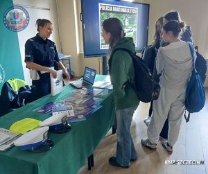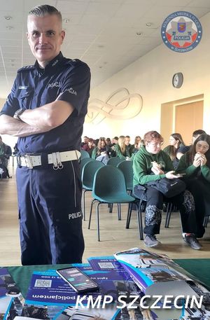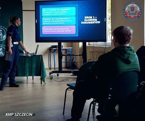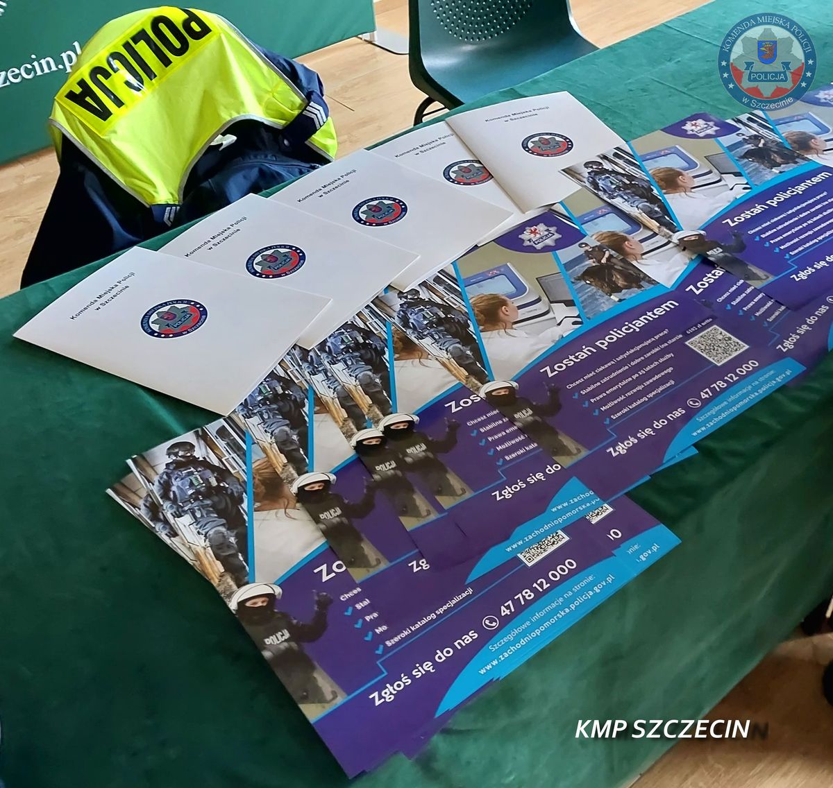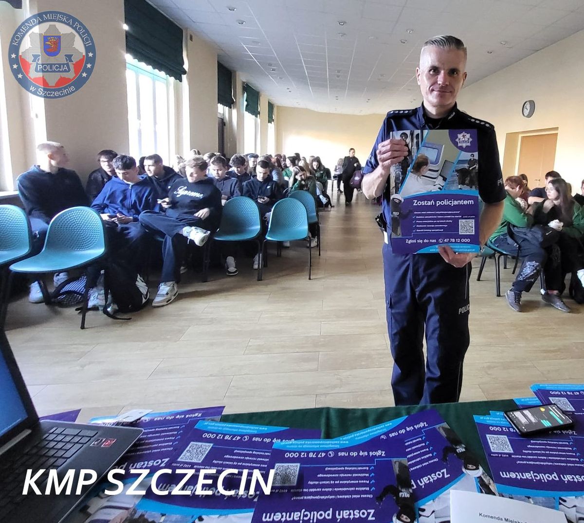 Podczas wizyty policjanci ze szczecińskiej drogówki opowiedzieli uczniom o codziennej pracy funkcjonariuszy, wymaganiach rekrutacyjnych oraz możliwościach rozwoju zawodowego w Policji.