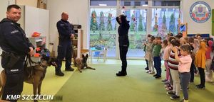 Ze względu na odwiedziny policyjnych psów służbowych Troi i Torka, wydarzenie cieszyło się wielką radością i poruszeniem wśród dzieci, które bardzo chętnie i żywiołowo brały udział w prelekcji na temat bezpieczeństwa.