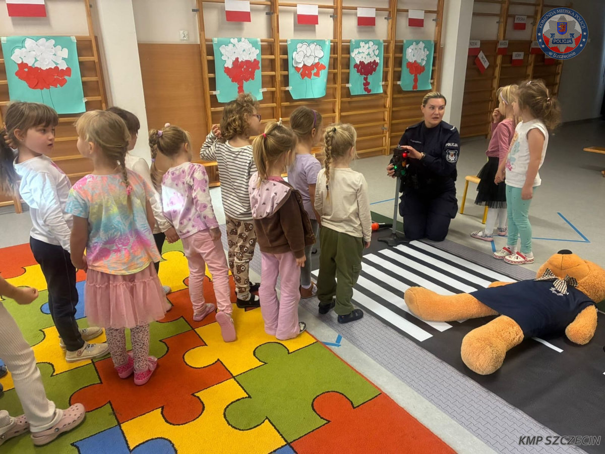 Podczas spotkania maluchy ćwiczyły przechodzenie przez pasy, zatrzymywanie się przed wejściem na jezdnię i obserwację ruchu po obu stronach. Funkcjonariuszka tłumaczyła znaczenie kolorów świateł oraz przypominała, że nawet na przejściu należy zachować czujność.