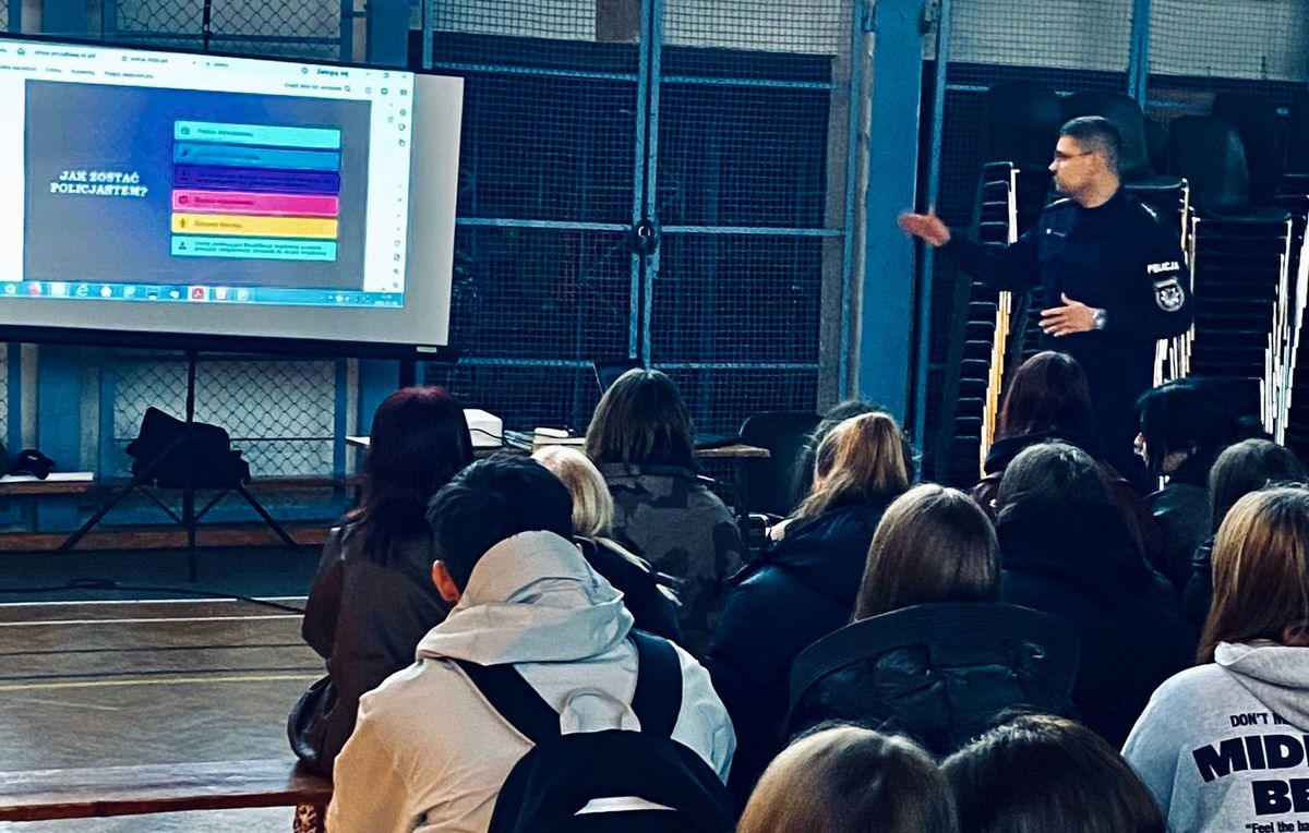 Funkcjonariusz Komisariatu Policji Szczecin - Śródmieście spotkał się z tegorocznymi maturzystami Technikum Ekonomicznego przy ul. Sowińskiego w Szczecinie przy Zespole Szkół nr 2. Spotkanie odbyło się w ramach kampanii rekrutacyjnej „Zostań jednym z nas” i miało na celu przybliżenie młodzieży specyfiki służby w Policji oraz zachęcenie do rozważenia kariery w naszej formacji.