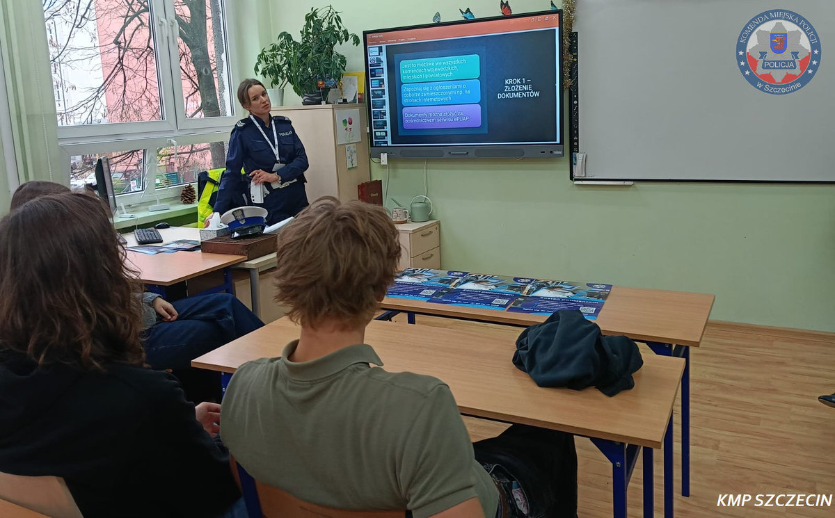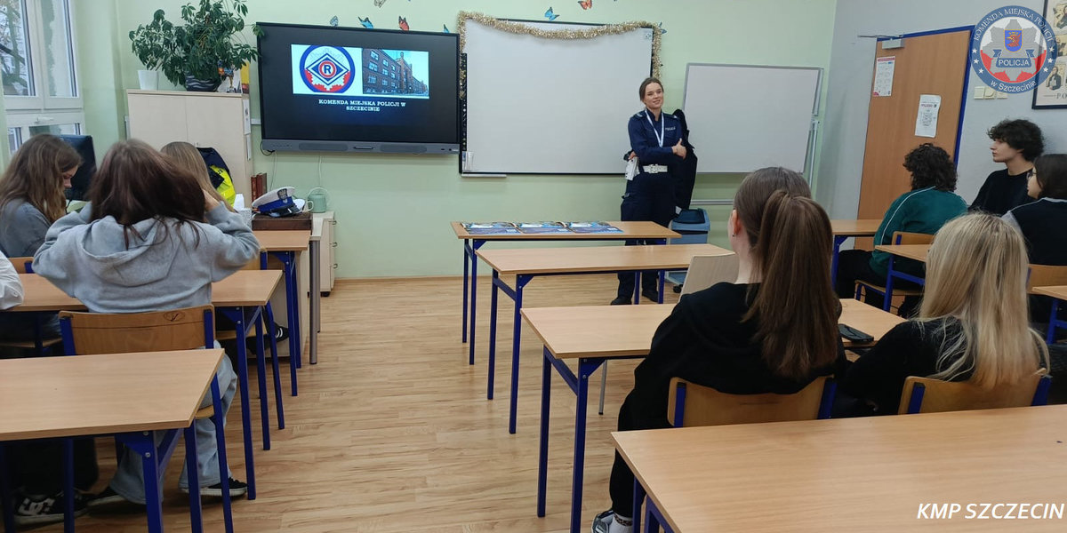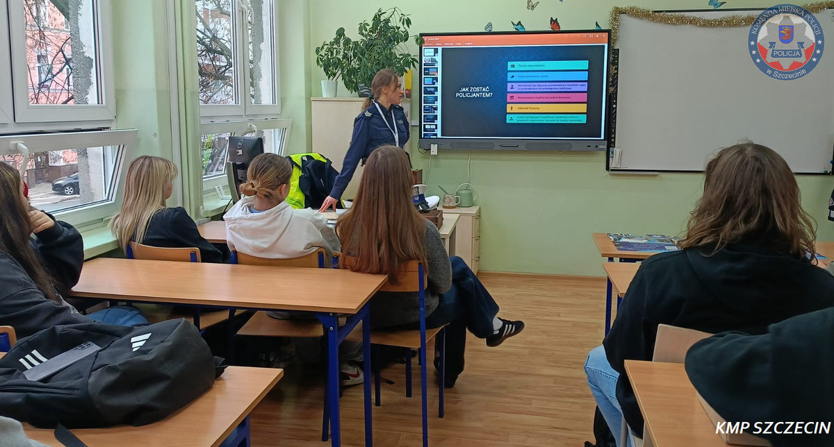 Policjantki Wydziału Ruchu Drogowego Komendy Miejskiej Policji w Szczecinie odwiedziły Liceum Ogólnokształcące Mistrzostwa Sportowego przy ul. Mazurskiej. Spotkanie odbyło się z udziałem czterech klas czwartych i miało na celu promocję zawodu policjanta.