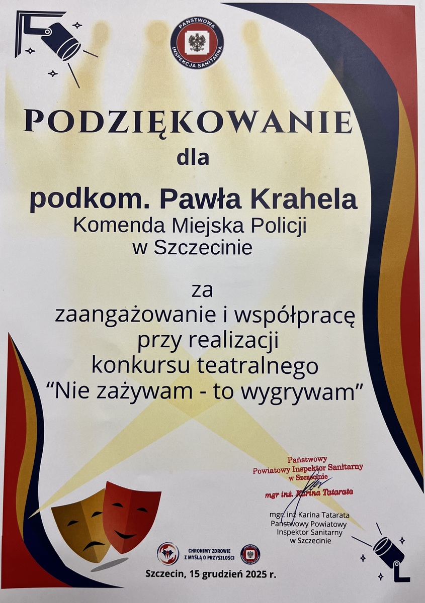 W Domu Kultury „Słowianin” w Szczecinie odbył się cykliczny konkurs małych form teatralnych pod hasłem „Nie zażywam – to wygrywam”. Wydarzenie zostało zorganizowane przez Powiatową Stację Sanitarno-Epidemiologiczną w Szczecinie we współpracy z Urzędem Miasta Szczecin oraz Domem Kultury „Słowianin”. Do współpracy przy realizacji wydarzenia zaproszono Eksperta ds. Nieletnich z Wydziału Prewencji Komendy Miejskiej Policji w Szczecinie, który aktywnie włączył się w działania profilaktyczne.