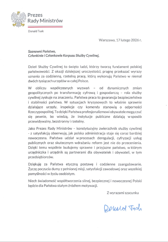 W związku z obchodzonym 17 lutego Dniem Służby Cywilnej Prezes Rady Ministrów skierował list do wszystkich członkiń i członków korpusu służby cywilnej.