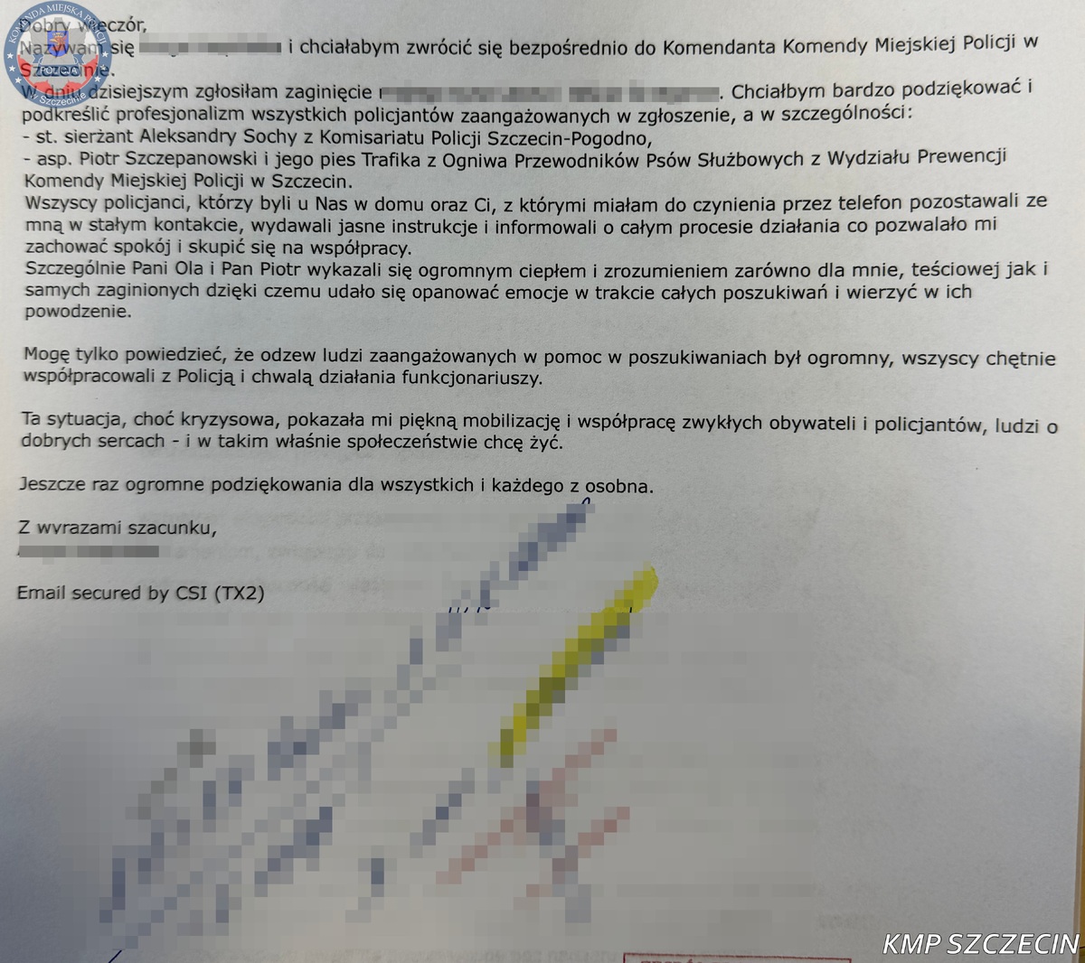 Dodatkowo do Komendy Miejskiej Policji w Szczecinie wpłynęły podziękowania za profesjonalną pomoc, w szczególności dla st. sierż. Aleksandry Sochy z Komisariatu Policji Szczecin Pogodno oraz dla asp. Piotra Szczepanowskiego i jego psa Trafiki!