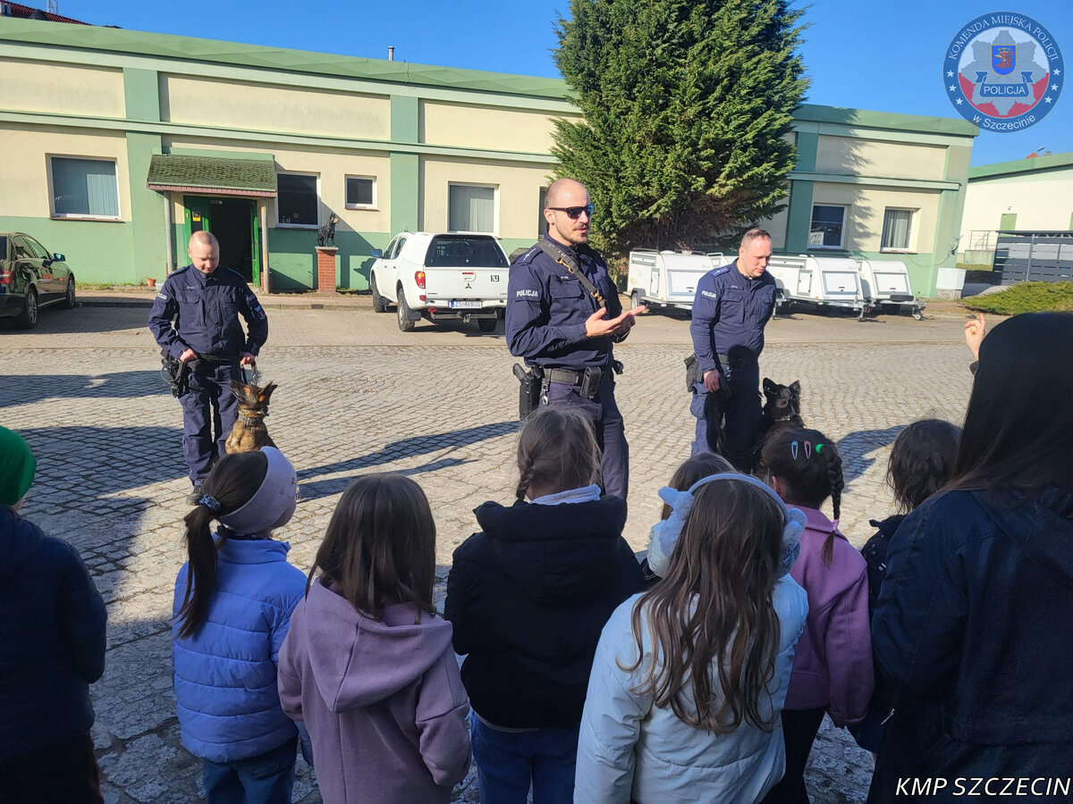 Dzieci uczestniczyły w pogadance dotyczącej zasad bezpiecznego poruszania się po drodze. Następnie, podczas wizyty w komendzie, uczniowie mieli okazję z bliska zapoznać się z pracą przewodników psów służbowych oraz ich czworonożnych partnerów.