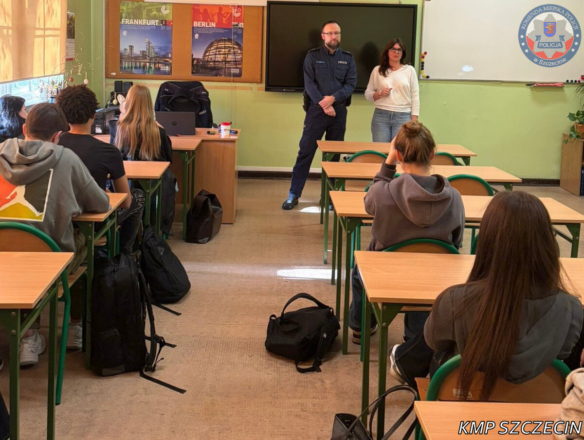 Uczniowie oraz studenci uczestniczyli w spotkaniu poświęconym odpowiedzialności prawnej nieletnich oraz prawom człowieka. Zajęcia poprowadził funkcjonariusz Wydziału Prewencji Komendy Miejskiej Policji w Szczecinie.