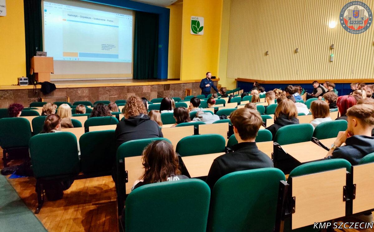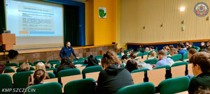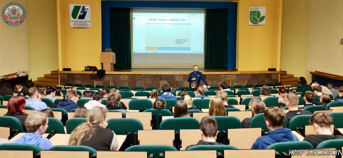 Funkcjonariusz Wydziału Prewencji Komendy Miejskiej Policji w Szczecinie spotkał się ze studentami Zachodniopomorskiego Uniwersytetu Technologicznego, aby omówić zagrożenia związane z używaniem środków psychoaktywnych.