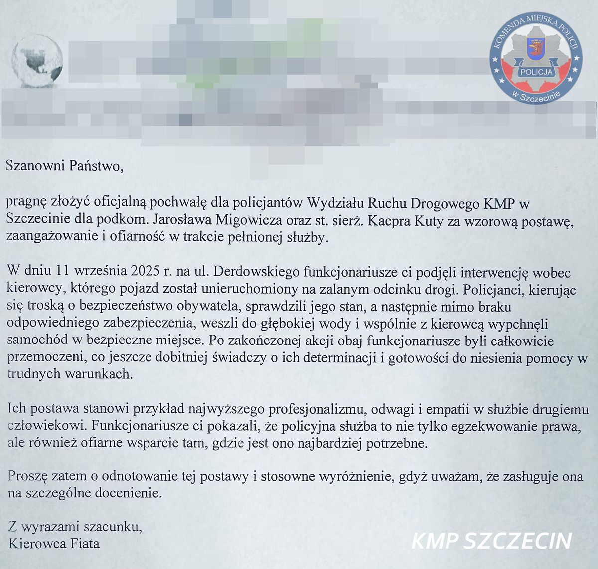 Podziękowania od obywatela za profesjonalizm i pomoc funkcjonariuszy z Wydziału Ruchu Drogowego KMP Powrót Drukuj